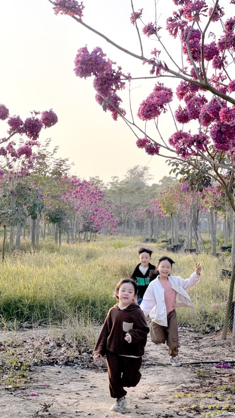 揭东区桂岭镇乡道X831围头村附近,成片的紫花风铃木下,孩童穿梭奔跑,无比天真烂漫,构成一幅冬日独特的风景图。