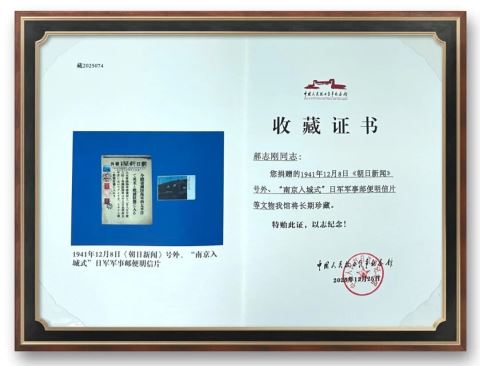 据了解,郝志刚此次捐赠的史料刊物分别为1941年12月8日《朝日新闻》号外和“南京入城式”日军军事便邮明信片。其中《朝日新闻》号外是日本发动太平洋战争、偷袭珍珠港事件的日媒报道,是日本主动挑起太平洋战争的原始新闻物证。“南京入城式”日军军事便邮明信片则记录了1937年12月17日日寇攻占南京后在中山门举行“南京入城式”的场景,是日寇在南京大屠杀期间炫耀武力、实施殖民占领的直接视觉证据,是日本侵华罪行的有力铁证和“自供状”。