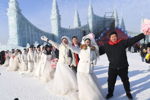 1月6日,在哈尔滨冰雪大世界园区,新人参加公益冰雪集体婚礼。当日,哈尔滨第四十二届“四季沐歌”公益冰雪集体婚礼在哈尔滨冰雪大世界园区举行。来自全国18个省、自治区和直辖市的42对新人以冰雪为媒,在冰雪童话世界里携手步入婚姻殿堂。 新华社 发