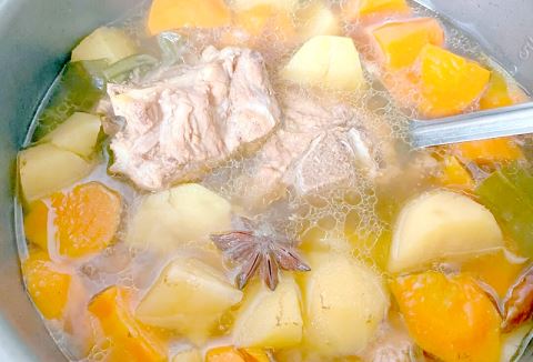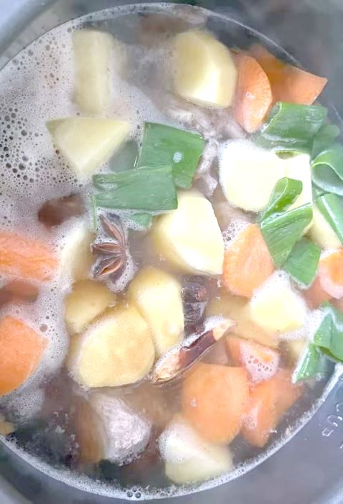 4.大火烧开后,加入适量的盐和酱油进行调味,然后将切好的土豆和胡萝卜加入锅中与排骨一起炖;30~40分钟左右就可以出炉。