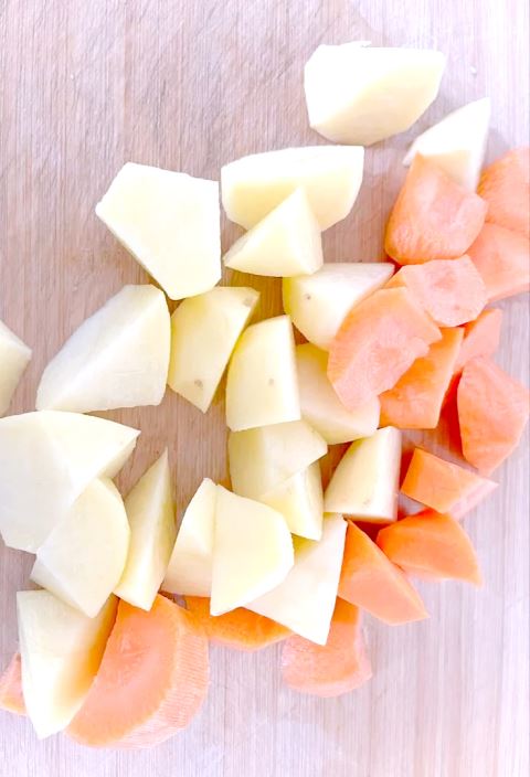 2.准备1~2个土豆、1根胡萝卜,将土豆、胡萝卜清洗一下,然后去皮切成块备用;