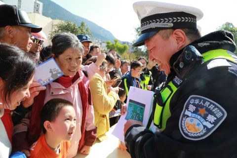1月10日,在云南省个旧市工人文化宫,个旧市公安局民警与市民进行交通安全知识有奖问答互动。当日,各地举办形式多样的活动,庆祝第六个中国人民警察节。 新华社 发