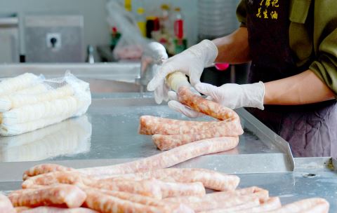 晨光熹微,作为揭阳市非物质文化遗产项目“郭氏腊肠制作技艺”传承生产基地的潮仁福腊肠工厂早已是一派忙碌的景象,切肉、拌料、灌肠、风干等工序交织出一幅生动的烟火画卷。潮仁福腊肠负责人、郭氏腊肠制作技艺非遗代表性传承人郭超群告诉记者,郭氏腊肠制作技艺可追溯至清宣统年间,从他的曾祖父郭武意开始,历经世代传承,至今已有逾百年历史,其制作过程充分体现了潮客饮食的精湛智慧。