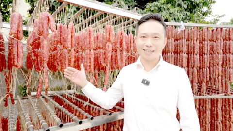 郭超群介绍腊肠天然晾晒的风味秘诀。