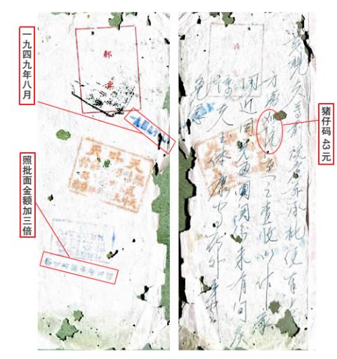 据吴旭介绍,1949年7月8日,中共中央华南分局在揭阳河婆镇成立了南方人民银行总管理处,并发行南方人民银行币作为华南解放区的统一本位币(简称“南方券”)。这封批信直接用南方券寄汇,并且背面印有一枚蓝色长方形印章,内容为“照批面金额加三倍”,正是特殊时期的烙印。“当时汇率变动剧烈,这种做法是为了保障侨眷利益而采取的临时性措施。”吴旭向记者介绍道。