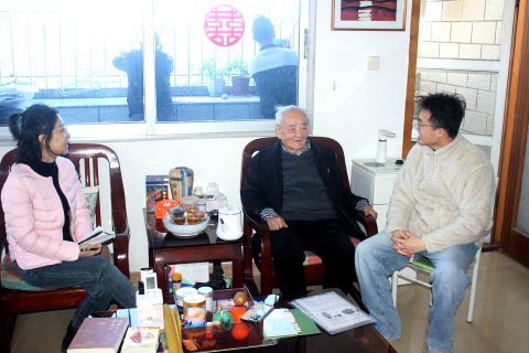 记者与郑国胜老人(中)、郑哲坤(右)交谈。阿 龙 摄