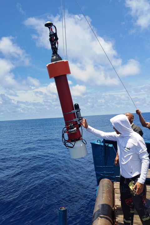 工作人员将我国自研海洋生物地球化学原位传感器搭载Argo浮标做海试布放(2025年5月15日摄)。
