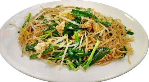 先尝油柑面条炒豆芽韭菜:面条吸足油脂香气,外带微酥、内藏筋道,豆芽爽脆多汁,韭菜裹挟着清鲜,每一口都是咸香交织,越咀嚼越有味道,解馋又饱肚。