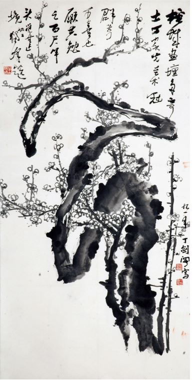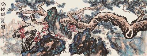 泼墨山水《黄山松石冠天下》(激夫先生题款)与小青绿兼浅绛的《群山出没白云中》(可达先生题款),均长5米,高2米。前者墨渖泼洒,重峦深壑,云烟涌荡,颇有点类乎苏词“大江东去,浪淘尽,千古风流人物”的豪迈;后者以笔胜墨,云海中,千峰竞秀,又颇有点类乎辛词“青山欲共高人语,联翩万马来无数”的雄奇。花卉画《大地回春图》(叔庸先生题款)与《福星照得寿星光》(可达先生题款),前者长5米,高2米,后者长3.28米,高1.46米。两图均以古松为主体,配以奇石,红梅清泉与牡丹梅竹则分别穿插于两个画面中;古松苍苍,或倾欹于泉石之上,如卧龙之奇崛,或壮势独出,如一身浩然之化身。两图皆以深墨重笔先声夺人,又不乏细秀用笔,并以青绿之着染及花色之红艳映发,构成了意韵丰饶的奇境。而纵观此数图,其笔墨之恣纵放逸,气象磊磊,实皆家光先生中国画艺术之厚积薄发。由此益知,昔年刘海粟先生以“纵横郁勃”誉之,谢海燕先生以“苍润浑朴”赞之,王伯敏先生以“得松烟老墨之韵”称之,皆非虚言;几位大家的评价相同性如此,也决非偶然。