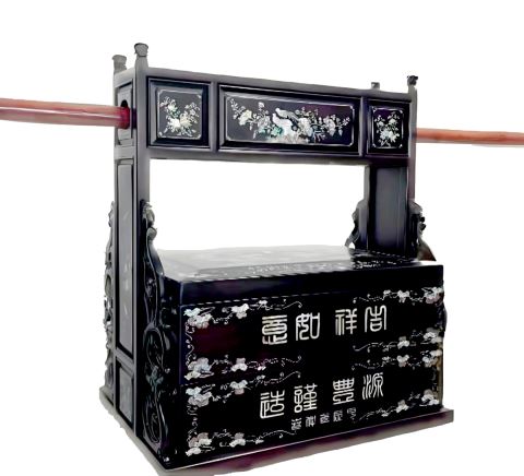 今赏读的这《龙凤呈祥》礼木盛专门作为婚嫁喜事中的下聘与出嫁之用。下聘时,里面装着聘礼,由男方的长辈用粗大竹竿穿过礼木盛上方的圆孔,一前一后肩扛着送往女方家中。结婚时女方则将嫁妆和别的物品放在礼木盛里面,同样由两位长辈肩扛着前往男方家中。这一对精心打造的礼木盛 ,可以说不仅是螺钿精湛技艺的展示,更是对婚嫁“龙凤呈祥”吉祥寓意的完美诠释,既是一对实用雅品,也是承载着深情与祝福的艺术品!
