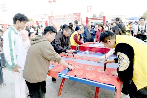 当天下午,三大子活动同时举行。“墨香送福·文化惠民”环节,多位省、市书法名家挥毫泼墨,将“竹报平安”“福满笋乡”等寓意融入春联,为村民送上定制化新春祝福(见图。林洁松 摄);“村艺体验·非遗传情”以“活态演示+亲子互动”模式, 让孩子们亲手剪纸、舞英歌等,近距离感受非遗魅力;“潮剧传习·雅韵扎根”活动中,专家与本土传承人现场授课,让潮剧雅韵在青年一代心中扎根。