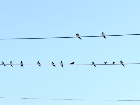 傍晚时分,夕阳的余晖将乡村染成了橙红色,揭东区桂岭镇玉步村村道旁的电线上,燕子密密匝匝地停在上面,既像五线谱上的音符,又像整齐列队的士兵,与电线杆下经过的行人形成一幅有趣的画面。