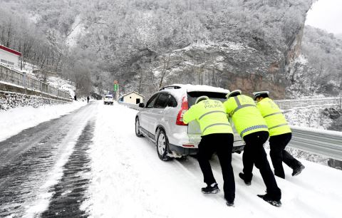 1月20日,在241国道湖北省襄阳市保康县后坪镇红岩寺路段,交管大队民警在协助被困车辆脱困。近期,针对大范围降雪及降温天气,各地采取多项措施积极应对。新华社 发