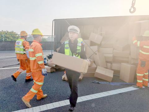 到达现场后,民警发现“整个路面都是散落的货物(电池盒和陶瓷品),面积有100多平方米,超车道、行车道相对较多。货物为易损品,清理货物难度较大,且存在安全隐患,容易引发二次事故”。面对复杂的现场,民警迅速制订“先防护、再清障、后保通”三步方案:到达现场后先设置安全警示区,疏导滞留车辆;随后,调派大型吊车、拖车及货物转运车辆投入救援,面对散落一地的陶瓷和电池盒,现场救援人员将没有损坏的货物搬到转运车上,再使用吊车将事故车辆吊正脱离;在清理出通行车道后,民警利用单车道引导车流缓慢通行,并通过车载显示屏、高德地图等平台实时发布事故信息,提示过往车辆减速慢行。