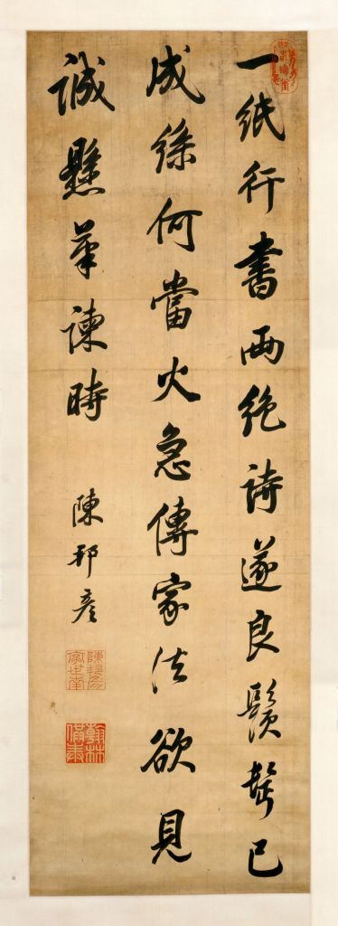 此书书体以董其昌为宗,笔墨沉着浑厚,又得颜真卿精髓。轻盈疏朗和雄秀端庄相结合的书风反映了陈邦彦行书的特色。