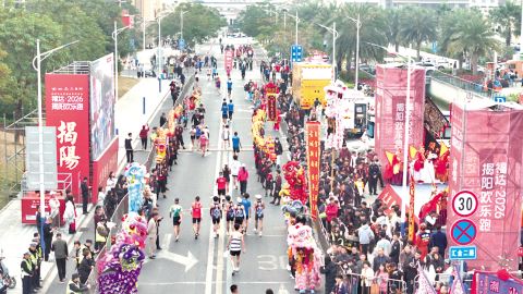 从起点到终点,潮州大锣鼓的铿锵声响一路助兴。赛事起终点及赛道沿线关键节点设置的35个表演点,非遗展演精彩纷呈,约10公里长的赛道成了流动的文化风景线。