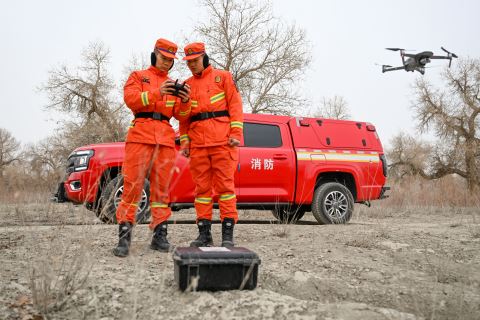 冬季,新疆乌鲁木齐消防救援机动支队库尔勒大队强化实战训练与联动巡防,开展地震救援专项训练,重点锤炼复杂条件下快速响应与科学处置能力。同时,该队紧抓防火关键期,联合尉犁县林草、消防等部门,深入重点林区、景区,协同开展携装巡护、隐患排查、防火宣传等工作,并对基层护林员进行装备实操培训,提升一线火险处置能力,织密森林草原防火安全网。图为1月23日在新疆巴音郭楞蒙古自治州尉犁县胡杨林区,消防员利用无人机进行空中巡护。新华社 发