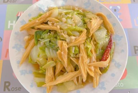 脆嫩清甜的白菜搭配豆香浓郁的腐竹,低脂高蛋白还易消化。腐竹富含钙质与植物蛋白,助力骨骼健康;白菜热量低且富含膳食纤维,两者同炒鲜香开胃。