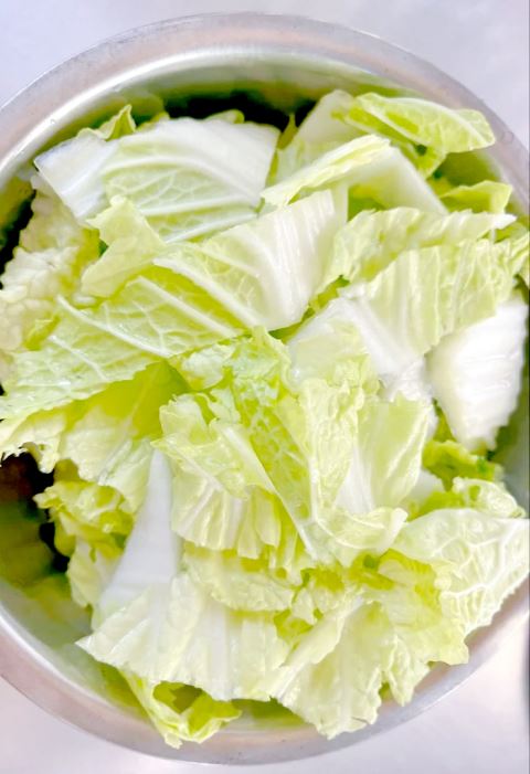 3.先倒入白菜帮大火翻炒1分钟,炒至帮部变软,再加入白菜叶继续翻炒30秒,至菜叶微微变软出水;