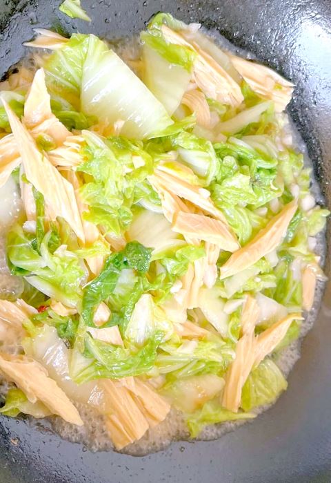 6.若锅内汤汁过少,可加1~2勺清水,翻炒至白菜完全断生、腐竹吸饱料汁,即可关火装盘。阿 萍 春 晖 文/摄 |