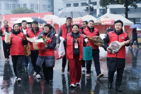 1月30日,淳安县的基层干部和新农人在农品市集现场拿着各自的农特产品向杭州市民推介。当日,“千岛好水润农品·书记领航共富路”书记进城卖山货暨千岛农品市集系列活动在杭州拱墅区运河广场启动,现场汇集来自浙江省杭州市淳安县的百余种山货,淳安各个镇村书记、新农人在现场向杭州市民推介淳安优质农特产品,吸引众多市民驻足品尝购买。 新华社 发