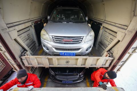 1月31日,在新疆乌鲁木齐中铁特货乌鲁木齐分公司三坪物流基地,工作人员在列车中固定待托运车辆。