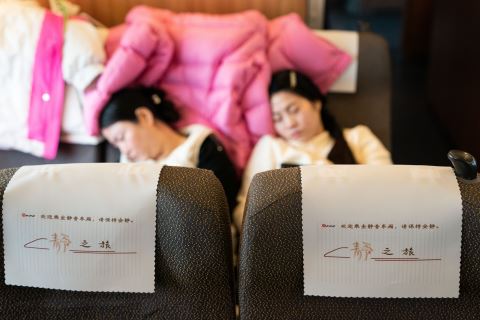 自2月1日起,高铁“静音车厢”服务将拓展至除动卧列车之外的“D”字头、“G”字头部分列车,全国铁路提供“静音车厢”服务的列车将超8000列。图为2月1日乘客在G54次列车静音车厢内。新华社 发