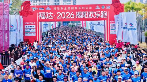 2025年3月,揭阳市首场全程马拉松——福达·2025揭阳马拉松赛的记忆至今仍在沸腾,国内外两万名跑友参赛,吸引游客45.33万人次,其中外地游客33.95万人次,占比达75% ;2026年1月开启的福达·2026揭阳欢乐跑,让广大跑者心跳同频,燃起新的全民之约。5000名跑友沿着榕江畔,一路奔跑一路饱览一江两岸的生态画卷,近4万人现场观看比赛,1700万人次观看直播,感受揭阳这座城市的古韵新风。