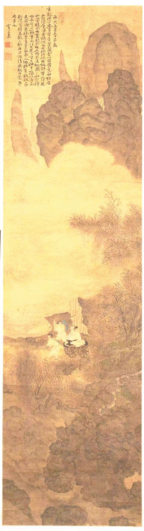 此图取材于唐代大诗人李白的故事。相传李白居地肺山时,曾以瓶瓿贮存山中的浓云带回居所,散之卧内,得以“日饮清泉卧白云”。图中李白端坐四轮车上,初入深山,仰望山间蓊蓊郁郁的浓云似行似驻,变幻无端,面带讶异又若有所思。二童子分立左右,一人搭绳牵车,一人荷杖引导。山石树木皆用暗色,藉以反衬画面中部大面积的白云。同时,又巧妙地借用水纹的画法以细线勾出波纹,或疏或密,表现出云雾强烈的流动性,以及“晴则如絮,幻则如人,行出足下,坐生袖中,旅行者不见前后”的种种变化。山石层叠而上,似方似圆,造型怪异;远山屈曲,如笋向天;老树虬劲盘旋,迥异凡尘,给人以静寂神秘之感。人物虽极小,却置于画幅最为显著的视点,并施以纯净鲜明的蓝、白、黑亮色,与背景的浓云暗树对比强烈,醒目而突出,体现出作者的匠心。崔子忠的绘画,热衷神仙、道释题材,此幅描绘被人们称为“诗仙”的李白,且使其置身于云出雾没、超然出尘的神山仙境之中,在尊颂先贤的同时,也寄托了画家自己对隐逸出世的向往和追求。 崔子忠(?~1644),初名丹,字开矛,后更名子忠,字道母,号北海,又号青蚓,晚明人,生年不详。先世山东莱阳人,寄籍顺天府(今北京)。他精通五经,能诗,并以文学知名于世,文翰之暇留心丹青。擅画人物、仕女,兼工肖像。画法高古,得自唐宋,是一位相对独立的画家,没有具体的师承。笔墨、设色颇具古意,构图、造型追求奇趣,超凡绝俗,风格独具,与同时代的晚明变形主义大师陈洪绶齐名,有“南陈北崔”之称。傅 撰 |