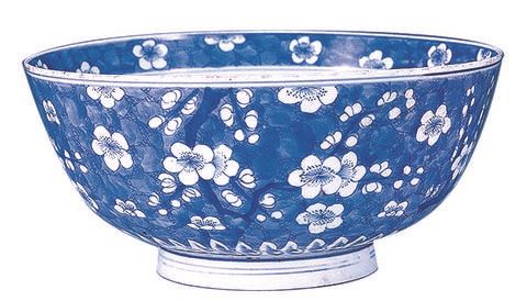 青花冰梅大碗,采用敞口、深腹、圈足的传统碗式,高约9.5厘米,口径20厘米。其胎体坚致细腻,修坯工整。碗壁以青花浓料绘制冰裂片纹,淡料晕染背景,形成“冰肌玉骨”的视觉效果。冰裂纹上绘以梅花,仿佛在严冬冰雪覆盖之时诞生新生命,寓意着生命的复苏和更新。梅花花瓣层次分明,或含苞待放,或傲然盛开,树干苍劲有力。青花发色纯正艳丽,呈深蓝色,清新不俗。胎质细腻洁白,冰梅勾画细腻,古典优雅,韵味十足。文人常以梅花自喻,借冰梅纹瓷器表达对“风骨”的坚守。