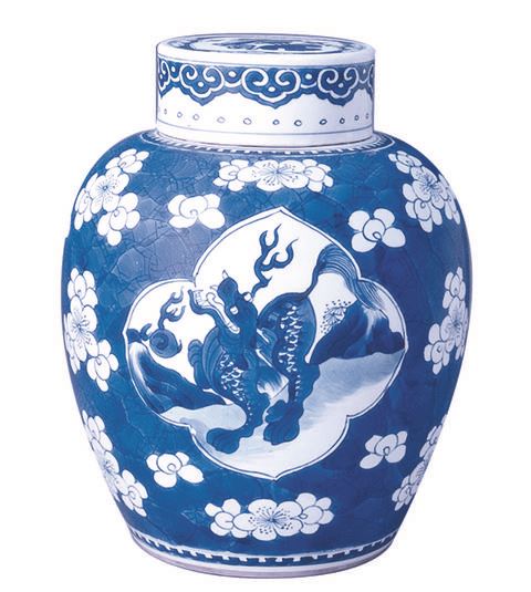 青花冰梅开光异兽图盖罐,通高为25厘米,口径8厘米,足径13厘米。罐身上冰梅花瓣细腻生动,梅花错落有致,繁密浓烈,艳而不俗,以其淡然悠远的冰裂,绽放着绝世独立的梅花,营造出“冰天雪地映寒梅”的意境。在冰梅纹的背景上,开光(即圆形、长方形等外框)内绘制传说中的瑞兽麒麟。麒麟全身麟甲,龙头、鹿角、狼爪、牛尾,立于波涛汹涌中的岩石之上。异兽图的加入,打破了冰梅纹的单一性,使器物在文人雅趣中增添威严与吉祥寓意。该罐在尺寸方面,该罐的通高、口径和足径均适中,既适合作为陈设观赏之用,也具有一定的实用性。其造型端庄、饱满,线条流畅自然,体现当时瓷器制作的精湛工艺。
