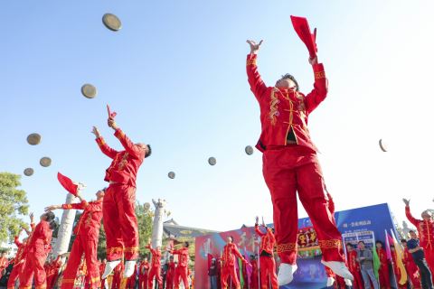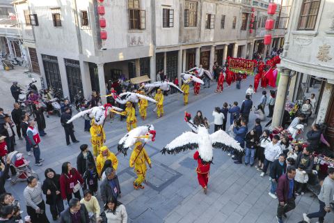 游客正在揭阳古城观看民俗文化表演。
