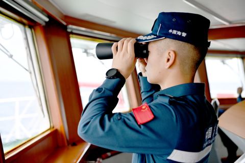 下图:这是中国海警万山舰执法员在进行观察瞭望(2月6日摄)。