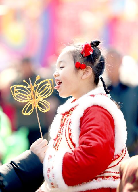下图:2月17日,在山东省临沂市郯城县郯国古城景区,一名小女孩在品尝糖画。新华社 发