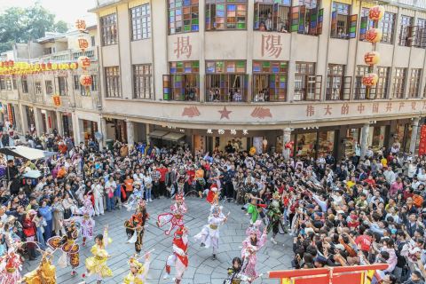节日里的揭阳古城,英歌舞等非遗展演异彩纷呈。