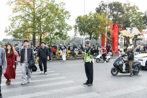 江永平介绍,春节期间,榕城大队出动95名警力在岗值守,叠加支队增援力量,每日共有217名警力驻守揭阳古城。他们在古城区域布设了55个执勤点位及3组违停清障组,实行6班轮转的高强度勤务模式,日均投入警力438人次,全力保障道路畅通,“游客能平安游玩,车辆能有序通行,就是我们所有执勤人员坚守的最大价值。”他也借机呼吁广大市民和游客,前往古城尽量选择绿色、环保出行方式,减少自驾车辆,避免造成交通拥堵。行经交通管制、绕行路段时,请自觉按照交通标志标线指引,服从现场交警指挥,文明礼让、有序通行;古城核心区11个停车场内,车辆要规范停放、有序离场,共同营造安全、畅通、文明的节日交通环境。