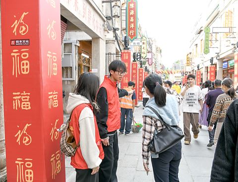 在中山路、绍兴路、青年之家——揭阳古城青年驿站、思贤路志愿服务点等地,志愿者们身着红马甲,穿梭在街巷路口与景点周边,分工协作、各司其职:有的化身“古城向导”,耐心为游客指引路线、讲解历史文化;有的值守在人流密集区域,引导有序游览、提醒安全出行;有的驻守服务点,免费提供热水、咨询引导、行李看管等暖心服务,用真诚与热情,让千年古城更有温度。