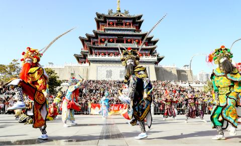 2月20日,民间艺人在陕西省咸阳市渭城区清渭楼广场表演英歌舞。新华社 发