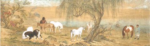 此画又称《八骏图》,画面上八匹骏马散放于郊外旷野之中,或卧,或立,或吃草,或嬉戏,自在悠闲,放牧者在树下休憩观望。放牧题材的画作不是对单匹马的写生,而是综合、融汇了各种马匹的形象,所以在创作过程中画家更能充分地发挥想象力,使马匹显得活泼自然、生动有趣。