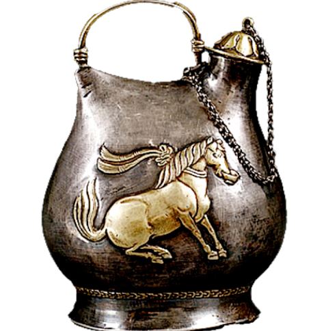 鎏金舞马衔杯纹银壶。陕西历史博物馆 藏