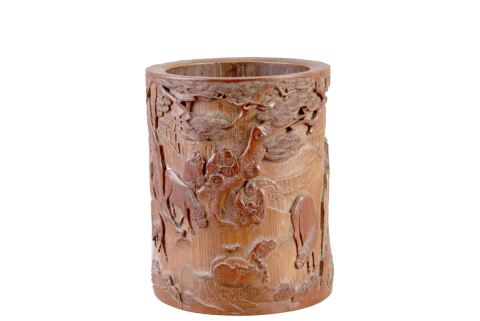 竹雕笔筒“松溪浴马图”。广东民间工艺博物馆 藏