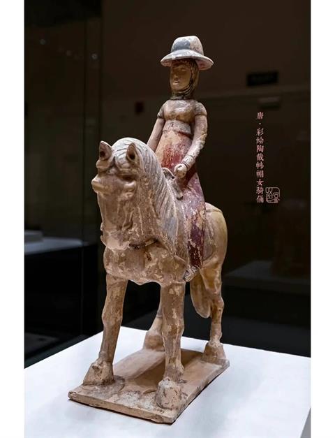 国家博物馆藏有一件1972年出土于陕西礼泉张士贵墓的“彩绘陶戴帏帽女骑俑”,时代为唐显庆二年(657)。据介绍,帏帽原为居住在西北地区的游牧民族出门防风用的实用性帽子,传到中原地区后成为贵族妇女出游的时尚性装束,在唐代初年很盛行,朝廷曾禁止这种风尚,反而却使其更为风行,以至“(武)则天之后,帏帽大行。”女俑戴帷帽、穿窄袖袍(胡风装束)骑马出行的形象,打破了传统性别束缚。胡服便于骑射的实用优势被唐人吸收,女性抛头露面、扬鞭策马的生活场景,折射出社会风气的开放和对多元文化的包容。
