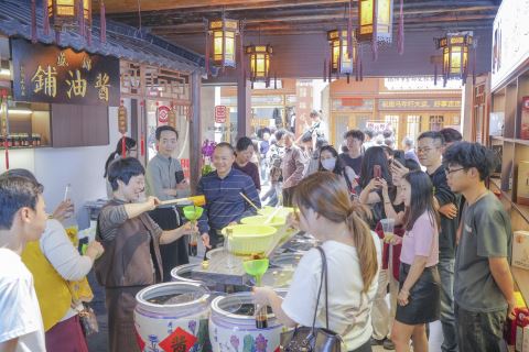 在马年春节这场文旅盛宴中,非遗元素的创新融入,成为古城文旅的一大亮点。位于古城核心区的锦盛酱油古城店,专门推出了“来揭阳打酱油”非遗文化体验活动,让游客在趣味体验中感受非遗魅力。这家始创于1911年的“广东老字号”,是省级非遗“揭阳酱油酿造技艺”传承基地,历经五代人始终坚守“日晒夜露”的天然发酵工艺。走进锦盛酱油古城店,一股醇厚的酱香扑面而来。经营者黄桂盛与家人身着传统服饰,笑容满面地招呼着进店游客。“各位客官,这边请!体验古法打酱油,感受揭阳老味道!”身着长衫的店员热情引导,游客们手持打酱油的竹筒子,在师傅的指导下,小心翼翼地将酱油从大缸中舀出,倒入印有进贤门图案的文创瓶中。“小时候总听长辈说‘打酱油’,今天终于亲身体验了!”来自上海的游客王先生拿着自己亲手打的酱油,兴奋地说,“不仅体验了传统工艺,还能把揭阳的非遗味道带回家,这份纪念意义十足。”