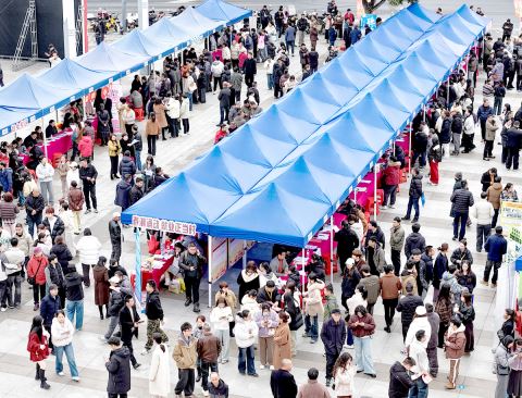 2月25日,求职者在浙江省建德市新春人才招聘会现场咨询应聘(无人机照片)。近日,全国各地举行形式多样的招聘活动,助力就业。