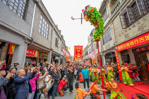 瑞狮起舞吸引众多市民和游客驻足观看。