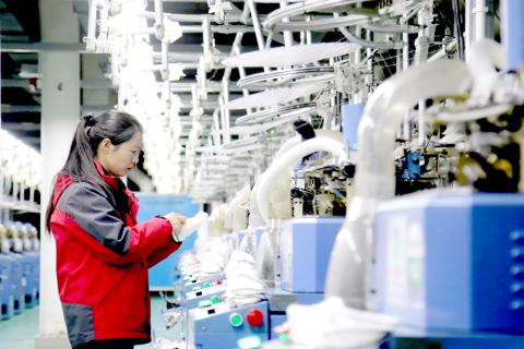 2月25日,在湖北省十堰市郧阳区一家智能纺织企业,工人在生产线上作业。