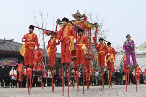 上图:3月3日,民间艺人在河南省焦作市非遗精品项目展演活动上表演“高抬火轿”。