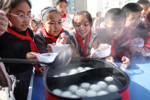 下图:3月3日,甘肃省兰州市东郊学校的学生在校园元宵节民俗活动上煮元宵。新华社 发