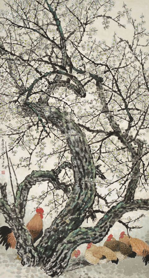 在近年来的各大展览中,卓愿都拿出了尺幅巨大、画面精湛的作品。尤其是《绿谷春声》《岭南盛夏》等全景式花鸟画,充分体现了自二十世纪下半页吸收外来艺术样式之后,得以在美术馆空间重新夺回一席之地的现代花鸟画体系的优势。譬如用写意焦墨笔触支撑起画面的骨架,再以双勾笔法精细刻画出茂林繁木的旺盛生命力,其中的禽鸟则糅合了宋画的格致之美以及现代学院体系的写生造型。同样的方法论其实已经不是岭南一家独长,当下全国各大美院及创作机构,都在使用这一套经几代前辈摸索得来的现代花鸟画语言。但是真正到展示的空间中同台竞技,则更考验画家自身的日课修炼以及把控能力。在这方面,卓愿无疑找到了自己真正的主场。