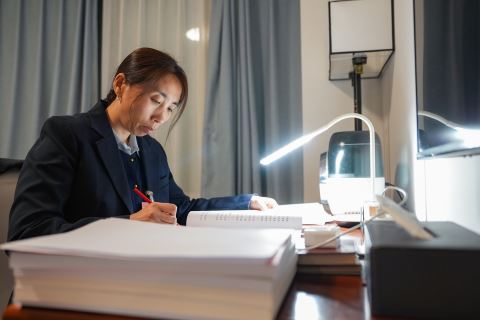 上图:3月6日,郭红静代表在天津代表团驻地阅读政府工作报告。